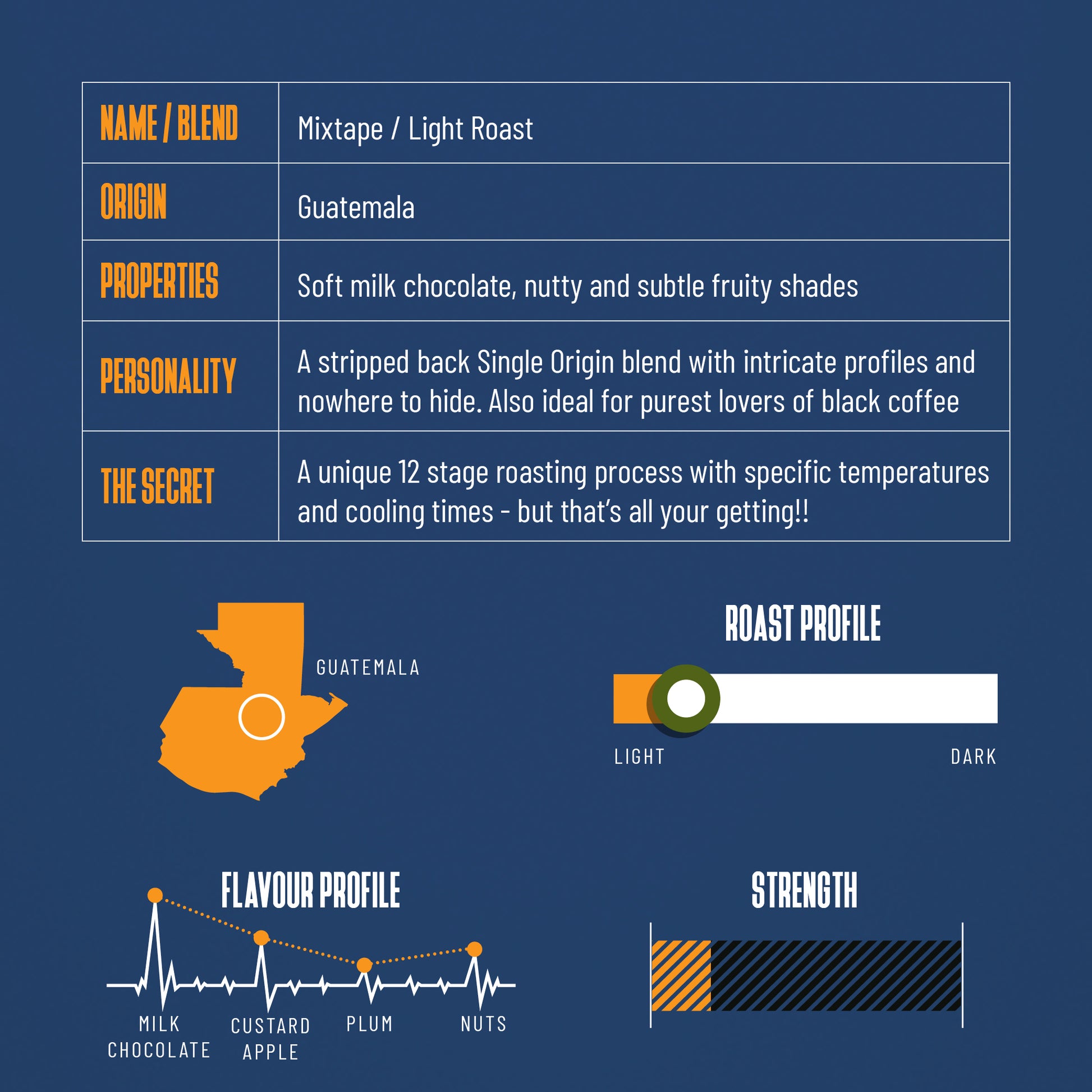 Mixtape is one of our lighter signature blends known for its mellow acidity. Derived from a family run coffee plantation hidden away in the misty mountains of Central America, the complex flavours sing through. Easy like Sunday morning, this light roast is smooth, uplifting and perfect to enjoy anytime, especially for those who are new to single origin coffee. Mixtape is the perfect selection and mix of flavours for your taste buds! Chat to our baristas and try a cup today!